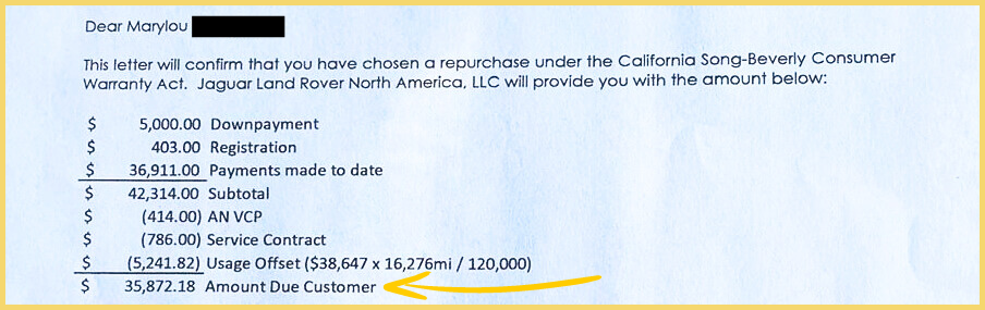 So the $36,000 represented the full price minus mileage costs, which are calculated according to a formula in the California Lemon Law.